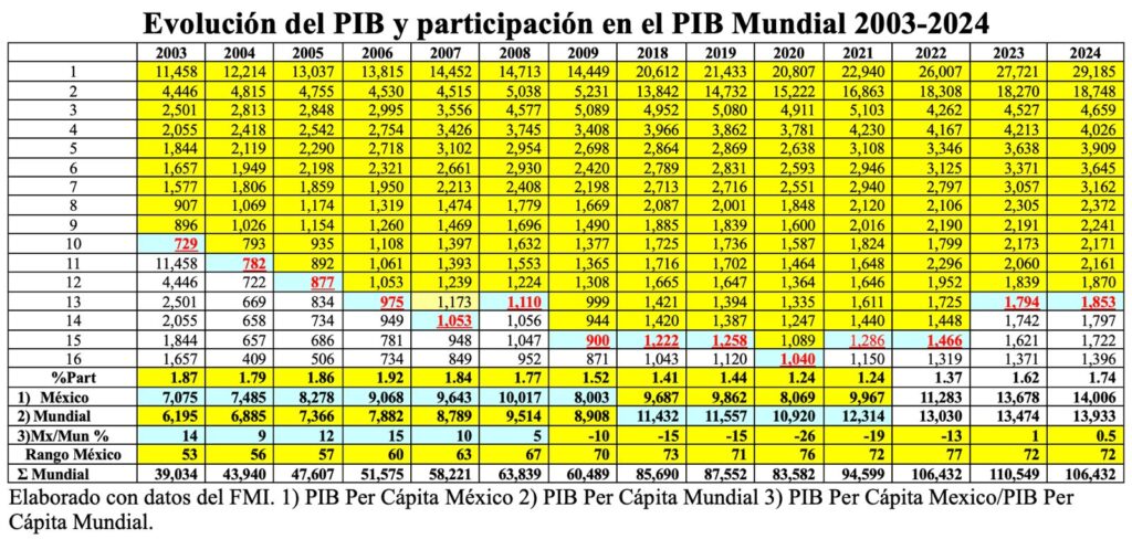 Conviene señalar que, en el año 1993, el valor agregado de nuestras exportaciones totales era de 58.8% y que, en la actualidad, el porcentaje se estima en sólo 40%, situación que ha incidido grandemente en la decreciente generación de riqueza en nuestro territorio, motivo por el cual en el periodo de 2002 a 2024, caímos de la 8ª posición como economía mundial a la 13ª; nuestra participación en el PIB Mundial cayó de 2.21% a 1.74%; y nuestro PIB Per Cápita pasó de la 53ª a 72ª posición.