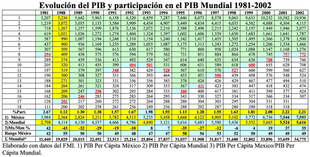 En 1981, México generó el 2.67% del PIB Mundial y se colocó en la 8ª posición como potencia económica debido, fundamentalmente, al auge de la producción de petróleo que hubo, misma que empezó a declinar en 1982 hasta caer al 17º lugar en 1988, año en el que el Nuevo Gobierno inició un proceso de desregulación de sectores claves de la economía mexicana que la hizo muy competitiva, al adoptar un esquema de Cambio Estructural que le permitió abandonar la monoexportación que estaba basada en el petróleo.