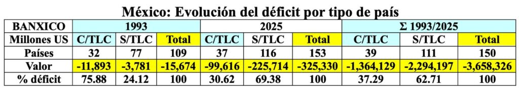 Independientemente de la integración comercial y productiva que se consideraba como elemento fundamental del TLCAN, se habló de una sana diversificación geográfica de las exportaciones, situación que fue pésimamente acometida por nuestros altísimos funcionarios pues, sin que aún entrara en vigor el TLCAN, negociaron TLC´s con Bolivia, Colombia, Venezuela y Costa Rica, situación que todavía empeoró con la “estrategia” de firmar TLC’s con 48 países adicionales, así como con la adopción de una incoherente desgravación arancelaria totalmente unilateral que debilitaron nuestras fortalezas y atomizaron nuestros esfuerzos con resultados superlativamente negativos pues, durante el periodo 1993/2025, el número de países con lo que hemos firmado TLC’s y registramos déficit, pasó de 32 a 37, con un valor de -11,893 a -99,616 millones y para el periodo completo fue de 39 países con un déficit acumulado de 1,364,129 millones US.
