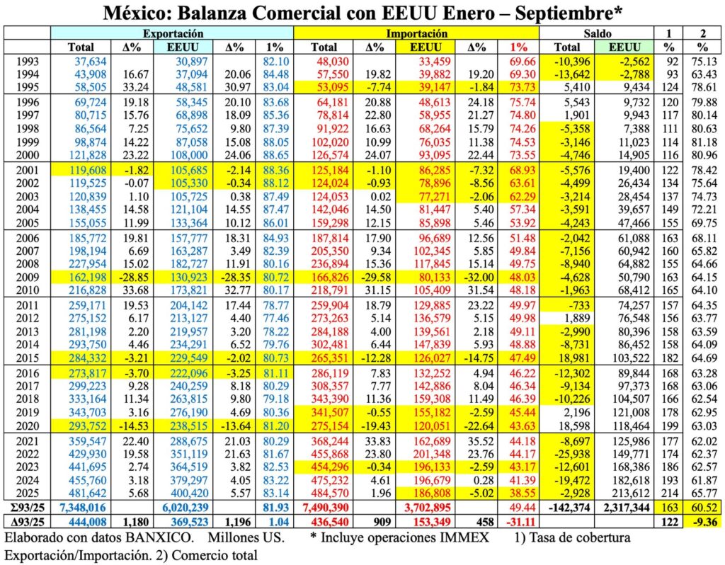 Esta situación se vuelve más nociva teniendo en cuenta que los bienes e insumos que Mexico importa de EEUU, han registrado un decremento enorme ya que si en 1993, el porcentaje era de 69.66% y, en 1996 alcanzó la cifra de 75.74%, para el año 2025, ese porcentaje se redujo a sólo 38.55%, sin duda, una caída nada lógica, tampoco favorable para México y para el valor agregado que se pretendía incorporar en la región a través de la producción compartida transfronteriza entre Canadá, EEUU y México.