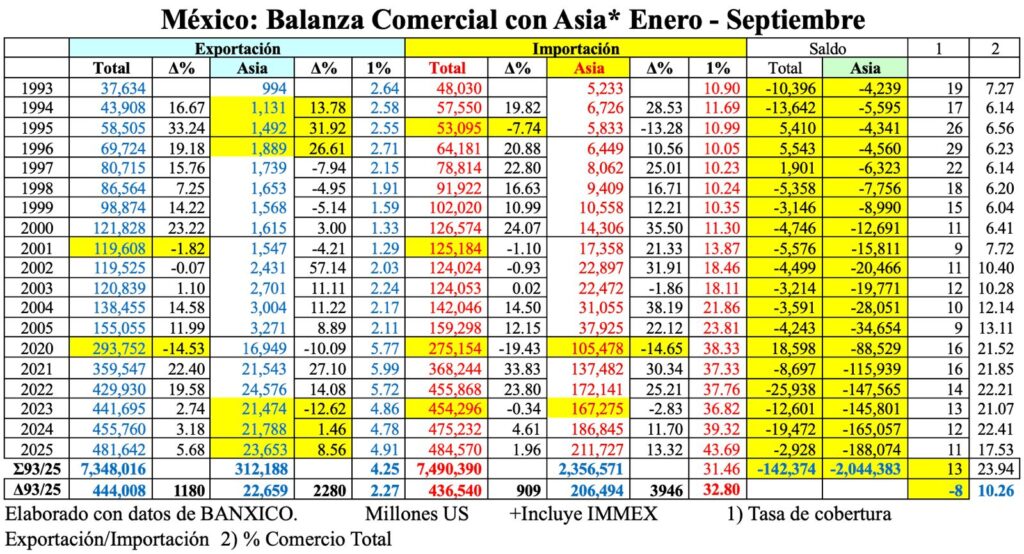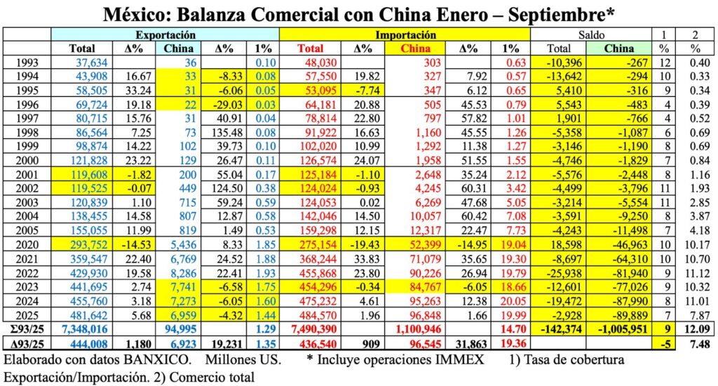En este contexto, el porcentaje de la importación procedente de China pasó de 0.65% en 1993, a 19.99% en 2025.