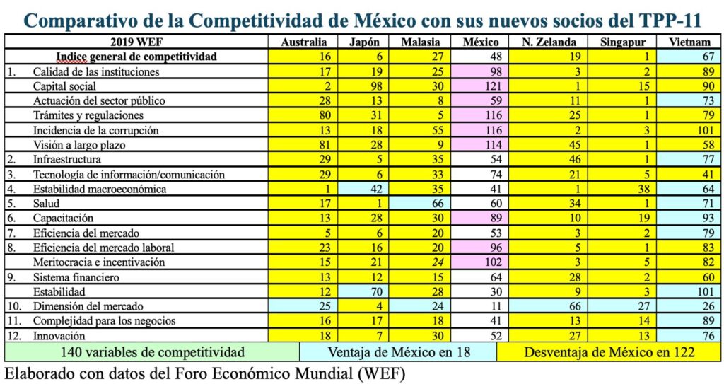 Peor todavía fue con la firma del TPP-11 pues, si durante el periodo de 25 años antes de su firma, México había acumulado un déficit de -131,036 millones US con los que serían sus 6 nuevos socios, en los primeros 7 años de operación, el déficit para nuestro país fue muy superior: -147,045 millones US pues, nuestro nivel de competitividad era pésimo y sigue siéndolo ya que, de las 140 variables que lo miden, nuestra desventaja se presenta en 122, con especial incidencia en la pésima calidad de las instituciones y sus funcionarios, incapaces de diseñar una estrategia, con programas, proyectos y políticas públicas realistas.