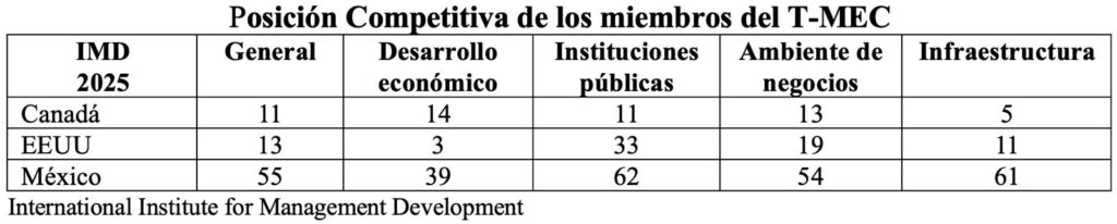 Conviene señalar que el IMD, recientemente publicó su análisis sobre competitividad de las 65 principales economías del mundo, situando a México en la 55ª posición, muy lejana de sus socios comerciales del T-MEC, saliendo pésimamente clasificado en las cuatro variables que se analizan.