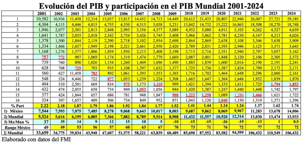 Por eso, en el periodo 2001/2024, México ha registrado enormes retrocesos como economía mundial pues, de la 8ª posición que ocupaba en el año 2001, para el 2024 cayó a la 13ª y, en relación con su PIB Per Cápita, el deterioro fue mayor ya que la caída fue de la 49ª a la 72ª posición, lo que significa una reducción en el bienestar de grandes núcleos de la población mexicana.