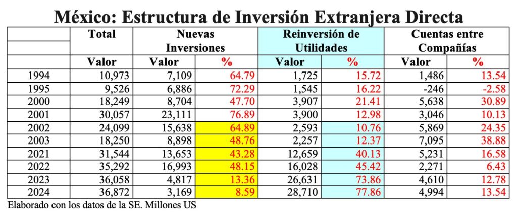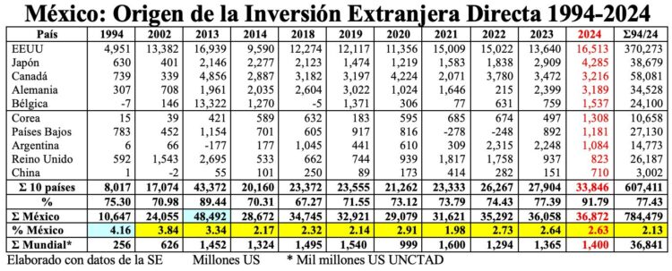 Conviene señalar que el total de flujos de 36,872 millones US, en el año 2024, fue equivalente al 2.63% del total de la IED Mundial, porcentaje inferior al de los años 2022 y 2023.