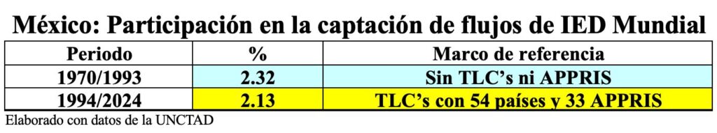 Conviene señalar que, durante el periodo 1970/1993, el porcentaje total de la IED mundial que México recibió fue de 2.32%, lo que resulta paradójico pues, en dicho periodo, nuestros altísimos funcionarios todavía no habían firmado TLC’s con 54 países ni los 33 Acuerdos de Promoción y Protección Recíproca de Inversiones (APPRIS) que supuestamente iban a generar enormes carretadas de flujos de IED hacia nuestro país.