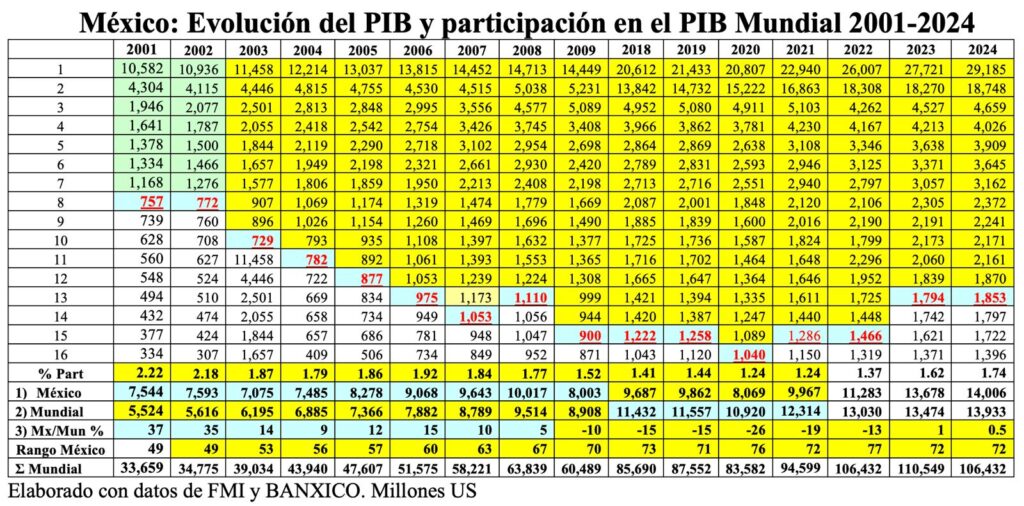 De acuerdo con los funcionarios mexicanos, la importancia del comercio exterior mexicano ha sido creciente hasta representar el 70% del PIB Total de México, situación que aparenta ser muy positiva, sin embargo, hay que realizar un análisis detallado de su estructura pues, especialmente, a partir del año 2001, la generación de riqueza de este agregado no se refleja en un crecimiento del PIB Total, sino al contrario, pues en el periodo 2001/2024, nuestro país ha perdido importancia como potencia económica al pasar de la 8ª a la 13ª posición mundial, en tanto que nuestra participación en la generación de riqueza mundial cayó de 2.22% a 1.74%.