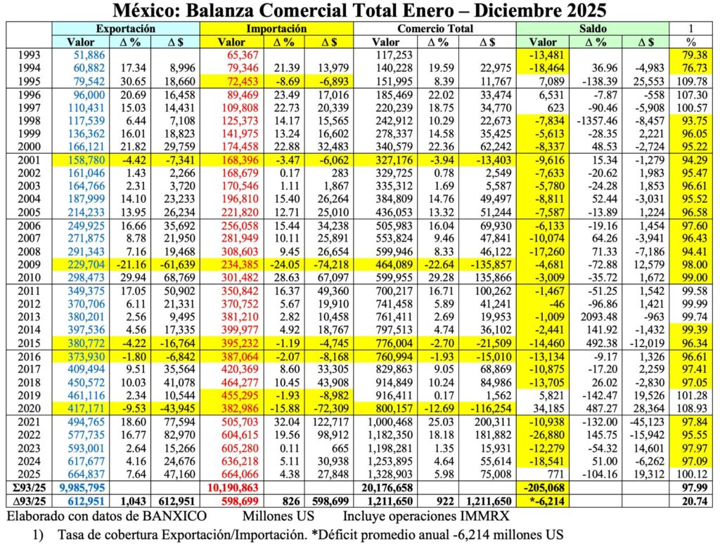 Como consecuencia de la evolución de estas variables, el total del comercio exterior de México ascendió a 1,328,903 millones US, con un superávit para México de 771 millones US en 2025.