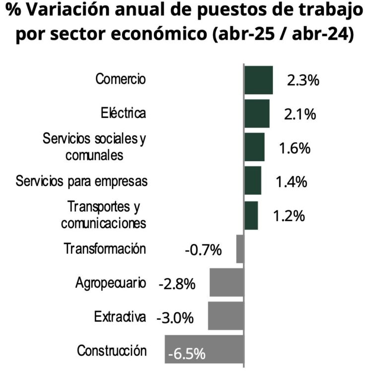 Difundió que en abril se registró una disminución mensual influenciada por el efecto de Semana Santa de 47 mil 442 puestos, el equivalente a una tasa de menos 0.2 por ciento.