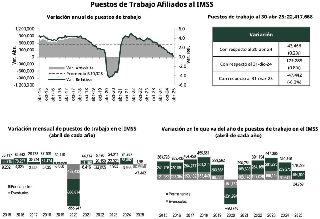Por otro lado y conforme al informe del instituto, al 30 de abril de 2025, se tienen registrados ante el Instituto Mexicano del Seguro Social (IMSS) 22 millones 417 mil 668 puestos de trabajo, de los cuales el 87.0 por ciento son permanentes, siendo la mayor proporción de los últimos dieciséis años en periodos iguales, y el 13.0 por ciento son eventuales.