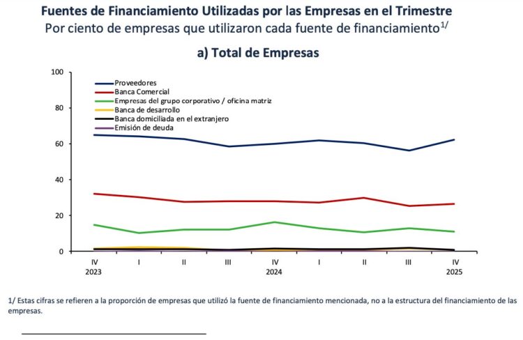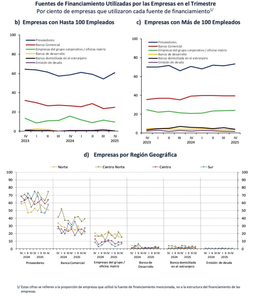 Valle de México, a 19 de febrero del 2026.- Al menos 62.2 por ciento de las empresas del país utilizó financiamiento de proveedores, 26.5 por ciento usó crédito de la banca comercial, 11.2 por ciento se financió de otras empresas del grupo corporativo y/o la oficina matriz, 0.9 por ciento de la banca de desarrollo, 0.9 por ciento de la banca domiciliada en el extranjero, y 0.2 por ciento por emisión de deuda.