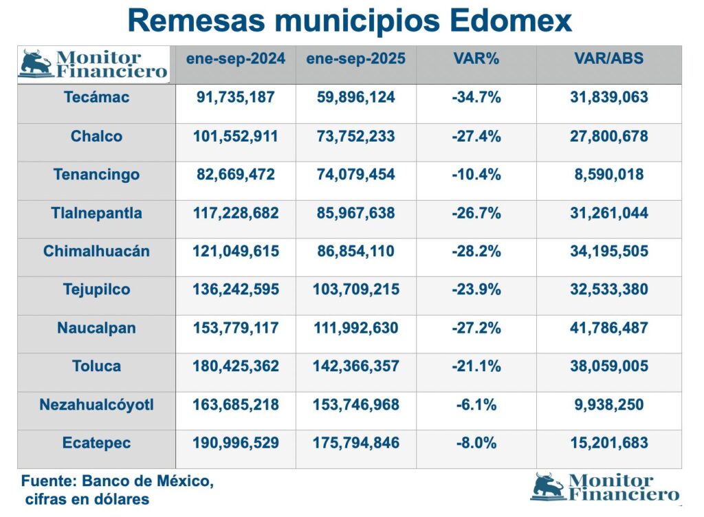 De acuerdo con datos del Banco de México, los diez municipios con los mayores flujos de dólares reportaron caídas de casi 35 por ciento, como fue el caso de Tecámac, con una diferencia de menos 31 millones 839 mil 063 dólares de diferencia en el comparativo enero-septiembre de los años 2024 y 2025.