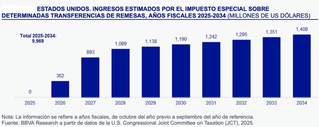 En la misma forma, la firma refirió que “El Comité Conjunto de Tributación (JCT) del Congreso de Estados Unidos estimó que podría obtener 10,000 millones de dólares entre 2026 y 2034 por el nuevo impuesto a las remesas. Si estos cálculos resultan ser correctos, y dado que 3 de cada 10 dólares de remesas de EE. UU. llegan a México, se estima que los mexicanos podrían llegar a pagar 3,000 millones de dólares por el impuesto a las remesas entre 2026 y 2034”.