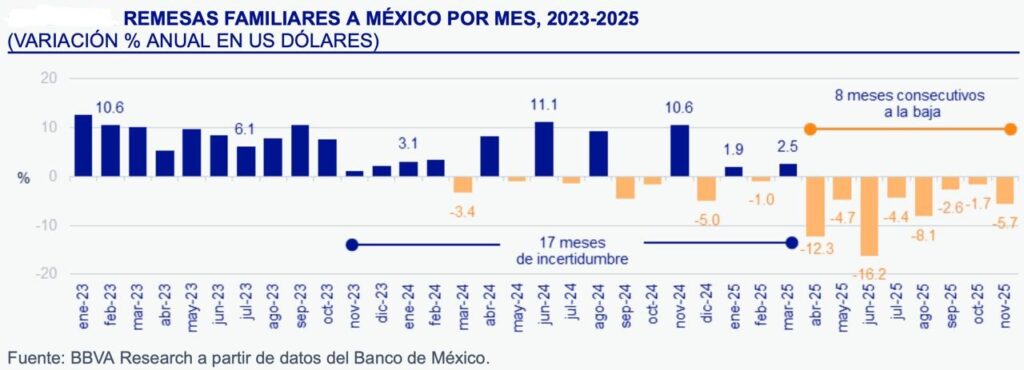 En el análisis, consideró que “el impuesto podría haber impulsado un mayor flujo de remesas en los pasados meses de noviembre y diciembre; aun así, la tasa de variación anual se mantendría en números negativos. Considerando este efecto, se estima que las remesas a México cerrarán en 61,700 millones de dólares en 2025, lo que equivale a una caída a tasa anual del 4.7 por ciento”.