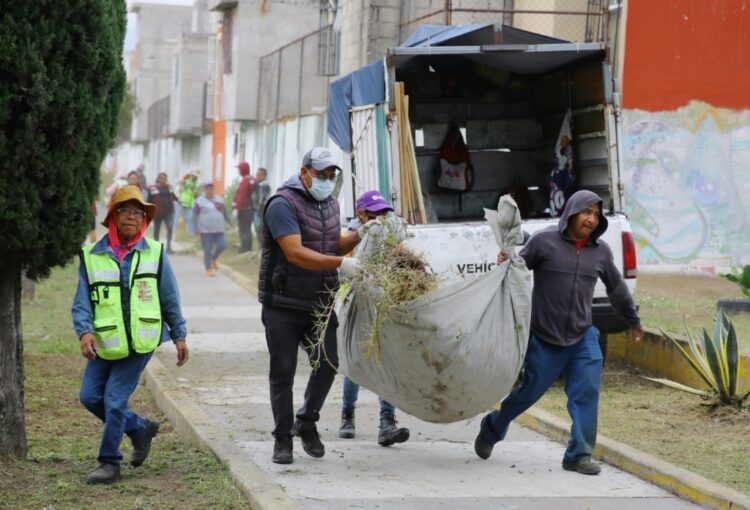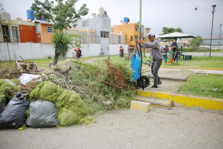 Valle de México, a 5 de octubre de 2025. Más de 500 trabajadores del gobierno municipal y vecinos participaron en la mega jornada de limpieza en el fraccionamiento Los Héroes Primera Sección para recuperar parques y espacios públicos abandonados por más de una década, luego de que la comunidad estuvo cooptada por el grupo criminal de Los 300.