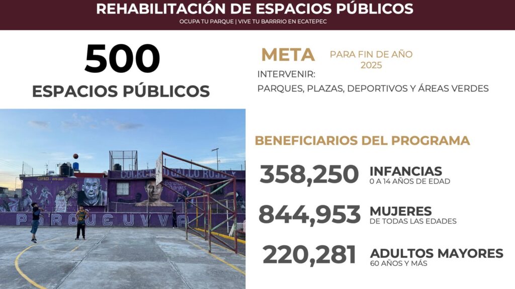 “En este gobierno partimos de una convicción profunda: Lo público le pertenece a todas y a todos. Hoy arrancamos con fuerza un programa para recuperar 500 espacios públicos en Ecatepec, son lugares que durante años han estado en abandono con instalaciones deterioradas e inseguros”, reiteró.