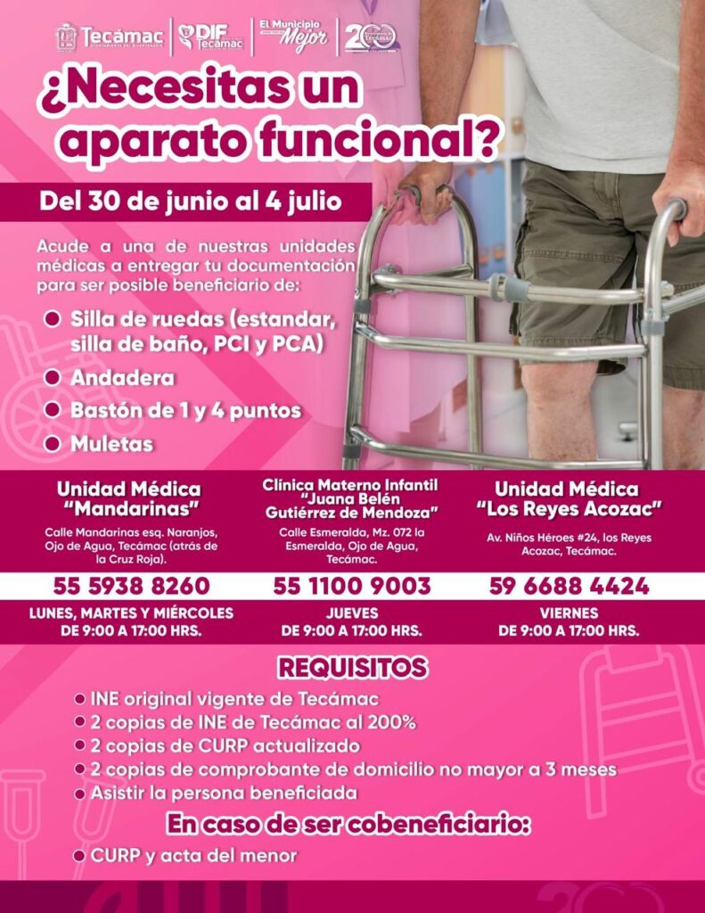 Valle de Mexico, a 30 de junio del 2025.- A partir de este lunes y hasta el próximo viernes, el Sistema Municipal DIF de Tecámac recibirá los documentos para solicitar la entrega de aparatos funcionales, como sillas de ruedas (estándar, sillas de baño, PCI y PCA), andadera, bastón de uno y cuatro puntos y muletas.