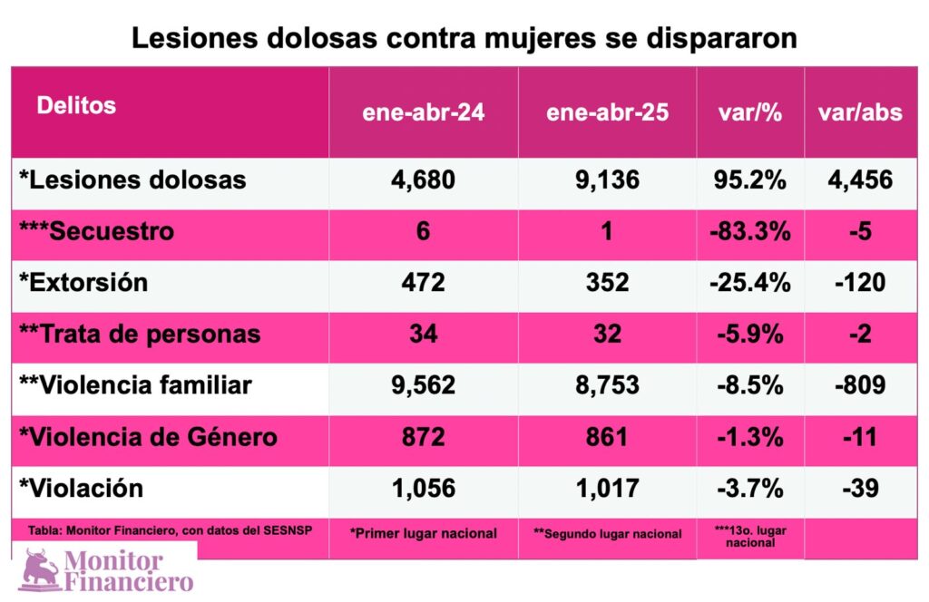 Por otro lado y conforme al informe del SESNSP, en la entidad mexiquense se redujo considerablemente en delito de secuestro, pasando de seis expedientes en enero-abril de 2024 a uno en igual lapso del este año (menos 83 por ciento o menos cinco casos), pero las lesiones dolosas continuaron creciendo: de 4 mil 680 saltó a 9 mil 136, esto es, un aumento de 95.2 por ciento (4 mil 456 expedientes más).