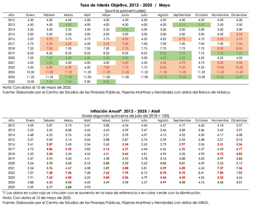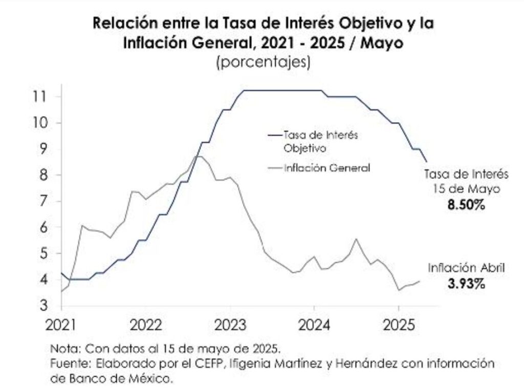 Por otro lado y según un análisis del Centro de Estudios de las Finanzas Públicas (CEFP), la reducción de la tasa de interés objetivo por parte del Banco de México estaría relacionada con un impulso al gasto de los consumidores y una mayor inversión por parte de las empresas, lo que elevaría la producción y el empleo, con efectos positivos en la recaudación de impuestos y en el costo de la deuda interna del Gobierno Federal en los próximos meses.