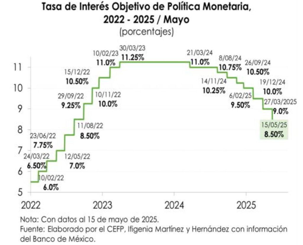 Valle de México, a 15 de mayo del 2025.- La Junta de Gobierno del Banco de México (Banxico) decidió, por unanimidad reducir, en 50 puntos base el objetivo para la tasa de interés de referencia, situándola en un nivel de 8.50%, lo que implicó su tercera disminución consecutiva en lo que va del año.