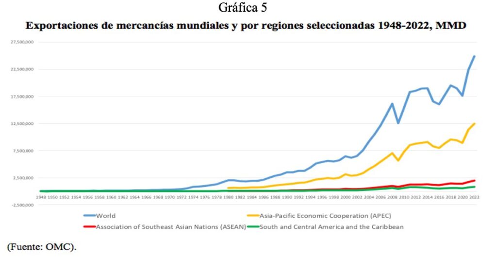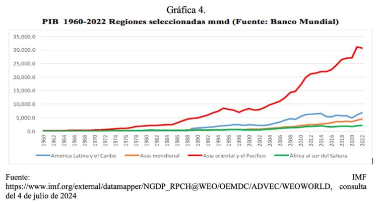 Como señalan Tzili et al. (2020, pág. 9)[3] “El eje de gravitación de la economía mundial en el siglo XXI ya se ha trasladado del océano Atlántico al Pacífico”. Esta aseveración se ve reforzada por los siguientes datos graficados: